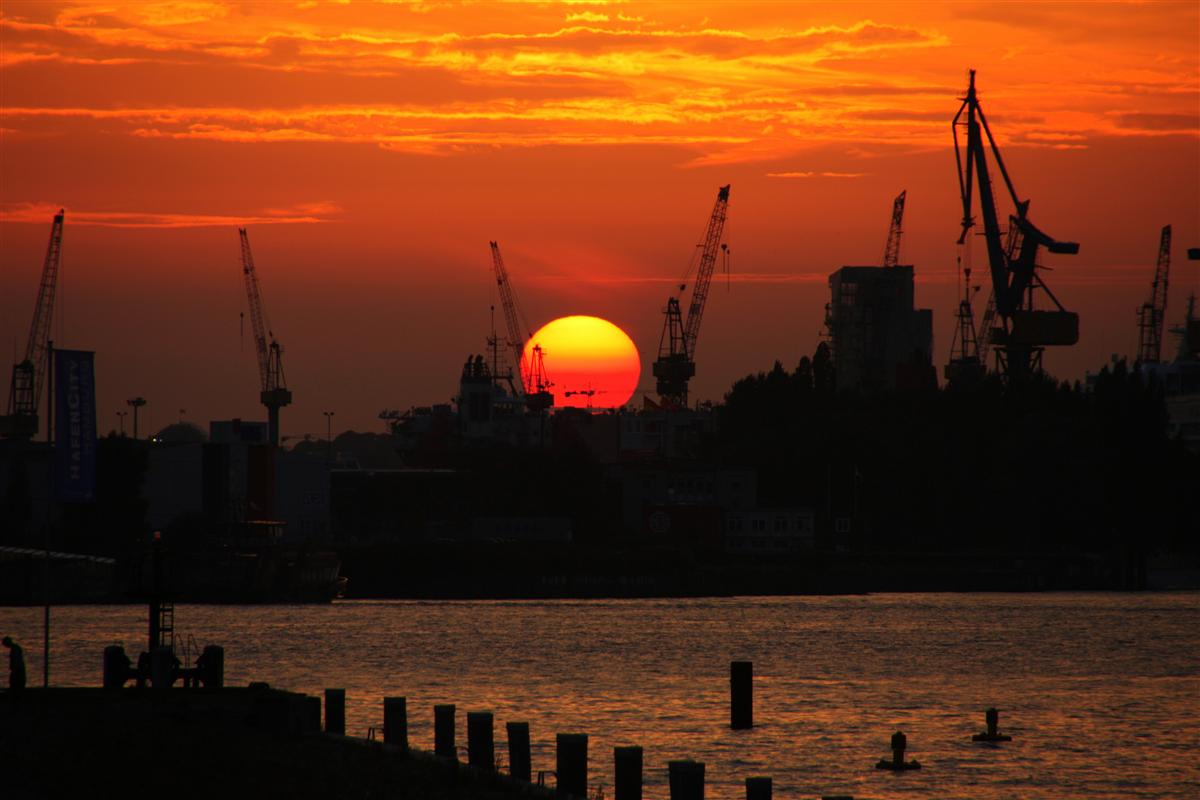 Das letzte Bild mit der roten Sonne hinter den Hafenkränen zeigt auch der NDR in seiner Galerie